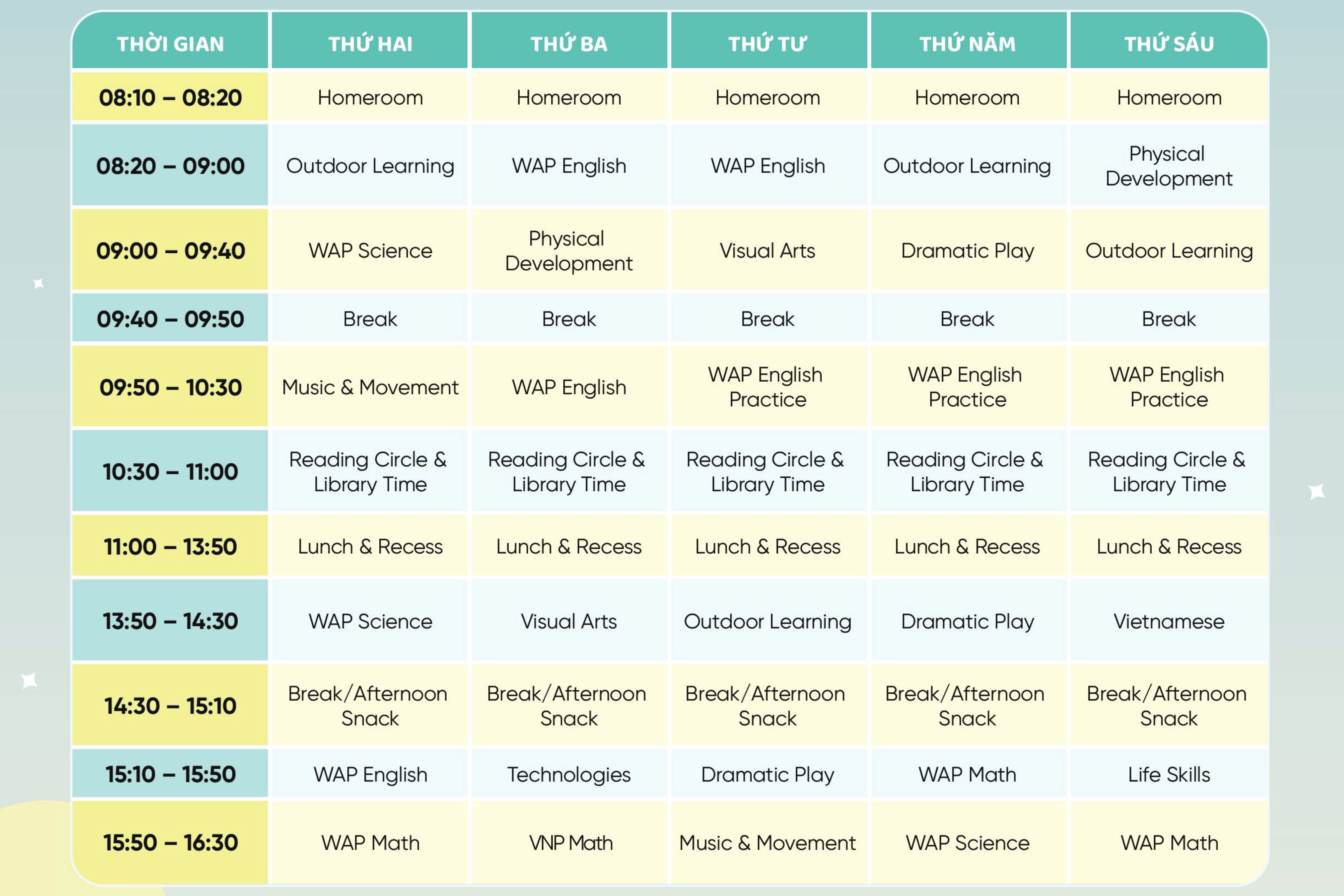 Các môn học thuộc Chương trình Mầm non Bang Tây Úc được triển khai với các hoạt động đa dạng, khuyến khích các bạn nhỏ suy nghĩ, đặt câu hỏi và khám phá thông qua trải nghiệm, tạo nền tảng vững chắc cho sự tự tin và tinh thần học tập chủ động.